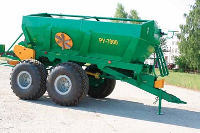Страна-производитель: Беларусь Фирма-производитель: Бобруйскагромаш Состояние: Новое Назначение: Внесение удобрений Цена договорная Распределитель минеральных удобрений РУ-7000 - для транспортировки и разбрасывания твердых минудобрений, извести, химмелиорантов. Транспортер подачи с 2 приводами - от колеса и ВОМ. Грузоподъемность - 8 т. Захват - 15-24 м. Вес - 5 т. Рабочая скорость до 12 км/ч. Производительность - 16-24 Га/ч. Агрегация с 2 т.к. и сцепкой ТСУ-3В.