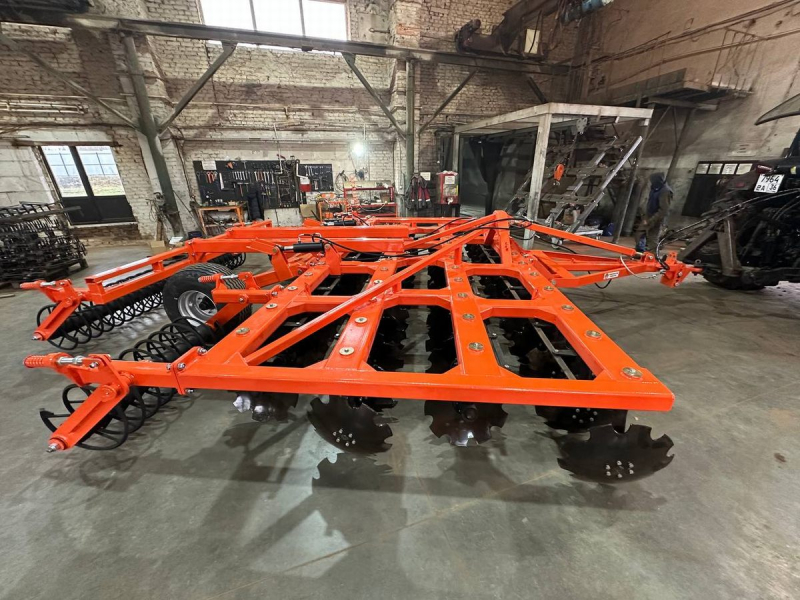 Технологии: Имеет складную конструкцию (гидравлическое складывание), механизмы регулировки угла атаки дисков, оснащается шлейф-катком для выравнивания и прикатывания.