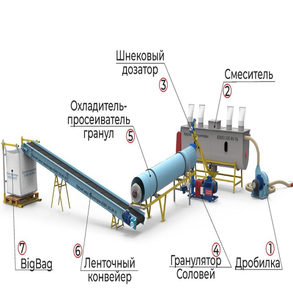 Линия производства кормовых гранул - это комплекс оборудования и технологический процесс для переработки сырья в однородные гранулы или пеллеты, которые служат кормом для животных, птицы, рыбы или других целей. Процесс включает смешивание ингредиентов, увлажнение (при необходимости), прессование смеси через отверстия матрицы и последующую нарезку.