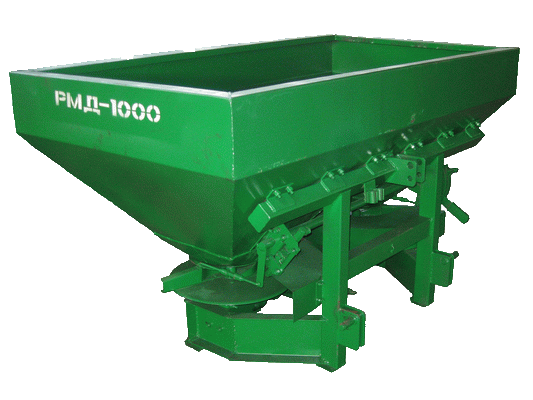 Предлагаем купить разбрасыватель минеральных удобрений РМД-1000 по привлекательной цене. Сельхозтехника производится в Украине. Агрегат предназначен для поверхностного разбрасывания твердых минудобрений (гранул и кристаллов) для подкормки, высева зерновых и седератов на полях и садах. Необходимая эффективность работы разбрасывателя достигается на участках с уклоном не более 8 град. Загрузка в полевых условиях осуществляется авто- и тракторными погрузчиками. Производительность - 16000 кв.м/ч. Захват - 14-24 м. Скорость транспортировки до 25 км/ч. Норма внесения в диапазоне от 40 до 10000 кг/Га. Объем бункера - 920 куб.см. Агрегация с 1,4 тяговым классом.